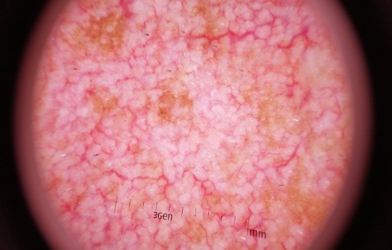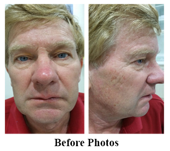 The improvement is even more marked when looking at his face with 20 x magnification- his brown blotchy pigmentation has virtually disappeared and the prominent enlarged veins on his face are much less obvious.