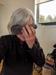 Get a face washer cloth, roll it up, dip the ends in water, squeeze out the water, put the cloth in your microwave for 15-20 seconds so the damp ends are hot but comfortable. Hold the moist hot ends of the cloth over your eyes for 2 minutes, then gently massage your eyelids with your index finger—down on the upper lid and up on the lower lid, focusing on the oil glands at the edges.