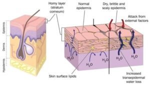 Keratinocytes are regularly shed from the skin surface. This loosening is caused by enzymes that need water to function effectively.